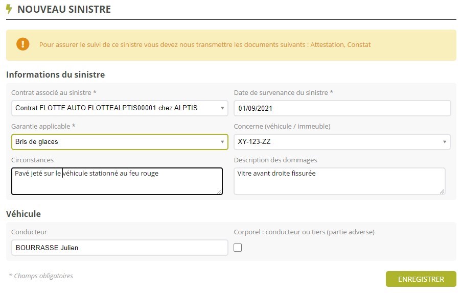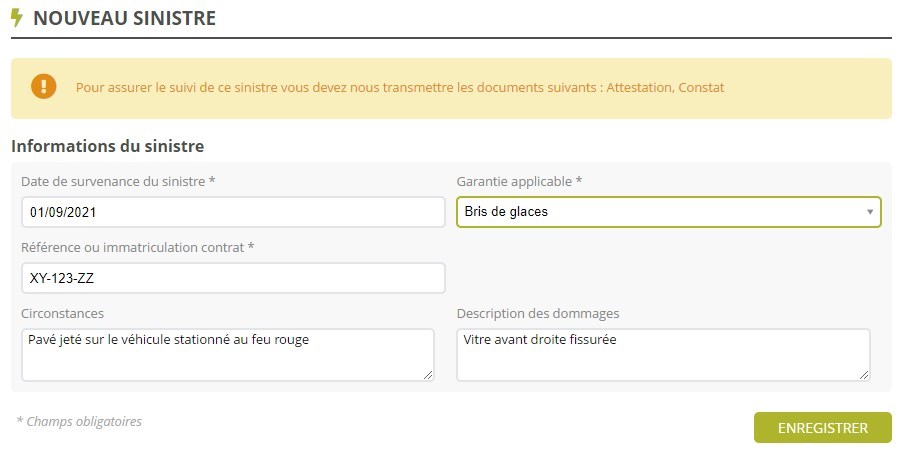Si la garantie choisie est configurée pour comporter des documents attendus, ces documents sont précisés dans un message en haut de page pour que le client puisse les déposer une fois sa déclaration effectuée (voir ci-dessous).