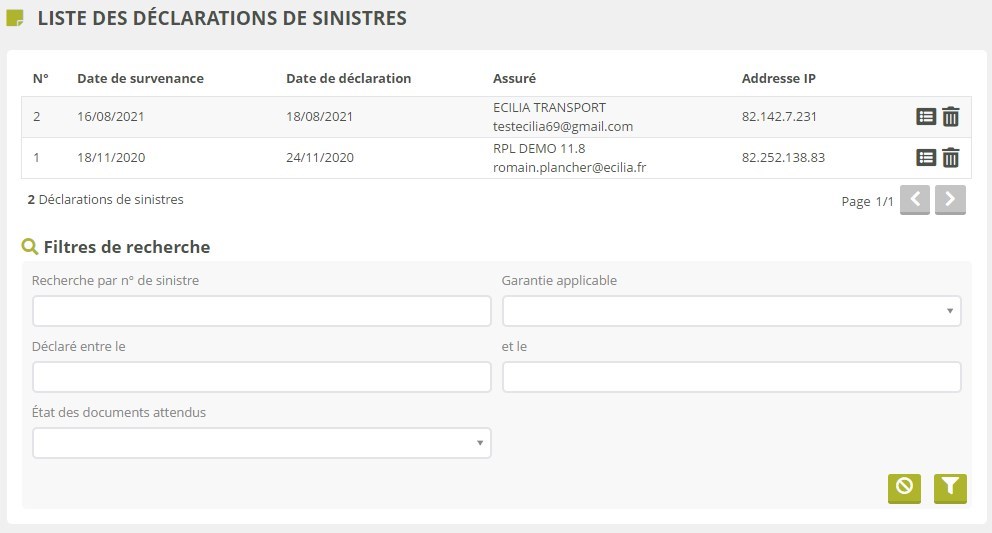 Filtres : si vous recevez beaucoup de demandes de sinistres, ces filtres vous permettront de traiter les déclarations par groupes, ou bien si un client vous relance pour la prise en charge de sa demande vous pouvez aussi la rechercher par son n° interne (que le client peut voir dans son extranet).