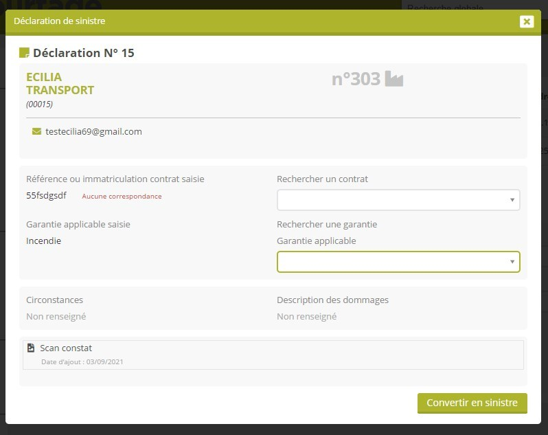 Convertir en sinistre : Enfin lorsque vous voulez confirmer la création du sinistre il vous reste à cliquer sur « Convertir en sinistre ». Cela vous renvoie vers la création d’un sinistre dont la plupart des champs sont préremplis à partir des informations de la déclaration.