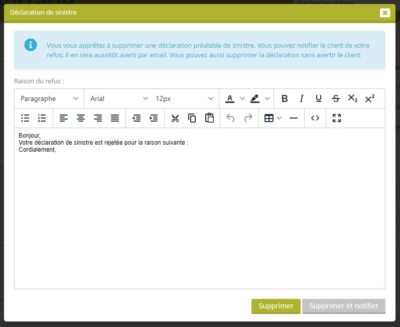 Compléter le contenu de l’email proposé à l’écran : cela réactive le bouton « Supprimer et notifier » qui supprimera la déclaration et enverra l’email au client, en utilisant le compte email par défaut de votre compte utilisateur.