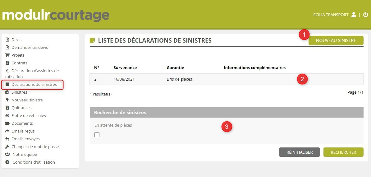Un nouvel écran est accessible depuis le menu de gauche : « Déclarations de sinistres », qui liste les déclarations en cours de révision. Il est également possible de déclarer depuis cet écran.