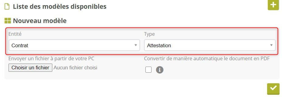 Les modèles d'attestation disponibles sont à choisir parmi tous les modèles de documents existants qui respectent ces deux conditions :