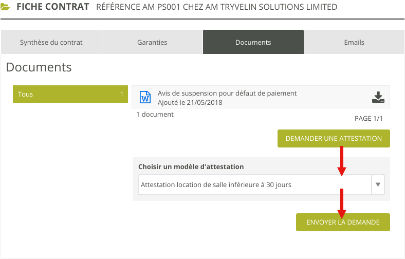 Pour activer la possibilité de faire des demandes d'attestation pour un contrat, il suffit de paramétrer au moins 1 modèle d'attestation sur le produit associé.