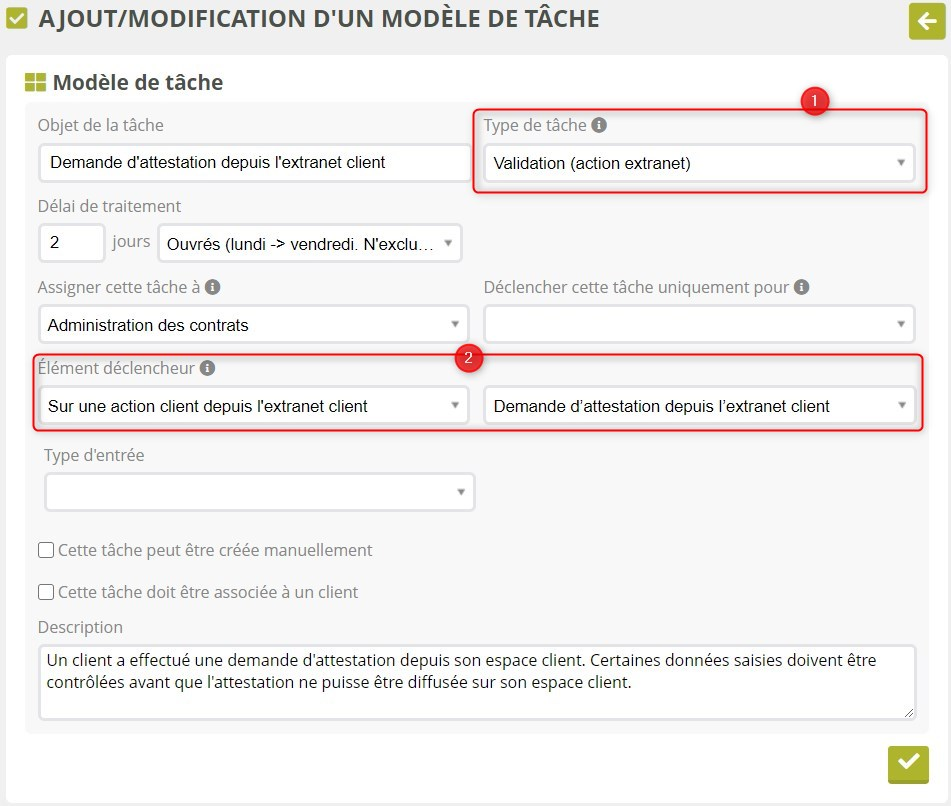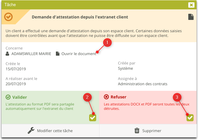 Au moment où le client finalisera sa demande d'attestation, et si une tâche de validation existe, Modulr générera une tâche de validation dans l'intranet pour les destinataires spécifiés :