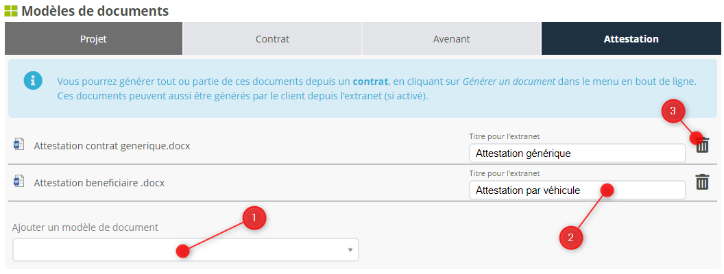 Indiquez ici l'intitulé qui sera affiché au client s'il a la possibilité de choisir entre plusieurs modèles. Si vous n’indiquez pas de titre pour l’extranet, les modèles d'attestations proposés afficheront le nom du modèle. Si vous ne proposez qu’un seul modèle sur le produit, l’attestation sera générée directement sans que le client ait le choix du modèle, et aucun titre ne sera donc affiché.
