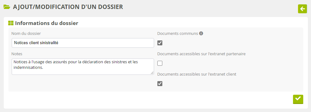 Notez que même si le dossier est accessible sur l’extranet, les documents doivent individuellement être notés comme visibles sur l’extranet (icône oeil vert).