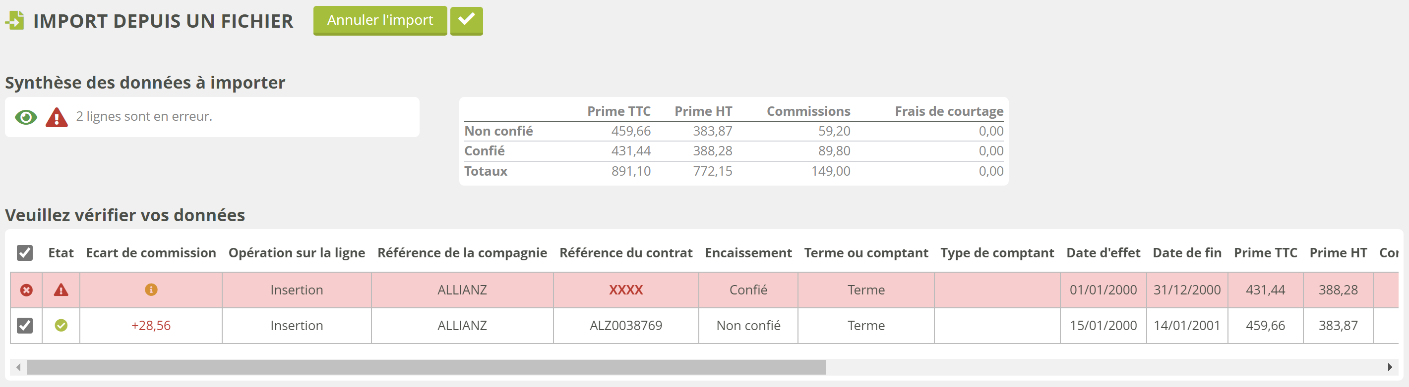Vous pouvez alors annuler l’import, corriger les lignes directement, ou valider l'import, après quoi les données valides sont automatiquement insérées dans la bonne fiche.