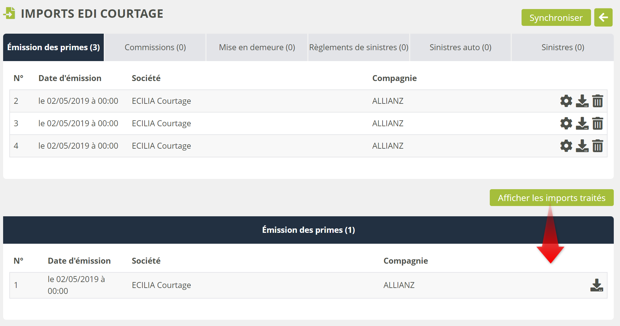 Par exemple : 9995A_9814_500_… indique un import de quittances (500) provenant de la compagnie dont le code EDI Courtage est 9995A, pour la société de courtage dont le code EDI Courtage est 9814.