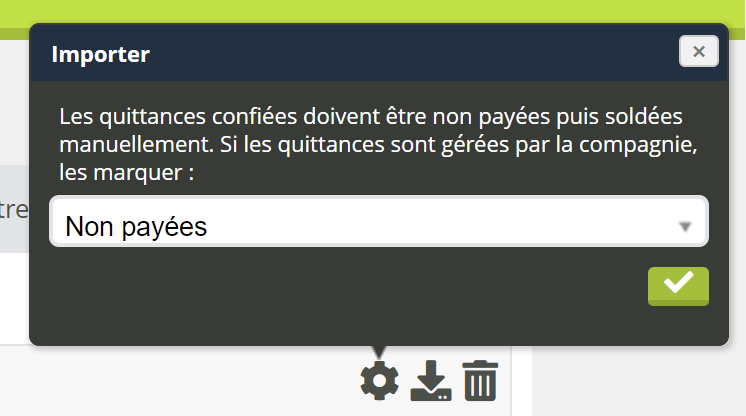Importer le fichier dans Modulr. Selon le type de message, des options peuvent vous être proposées. Par exemple, lors d’un importe de quittances (message 500) vous devez indiquer si les quittances de cette compagnie sont supposées déjà payées ou non :