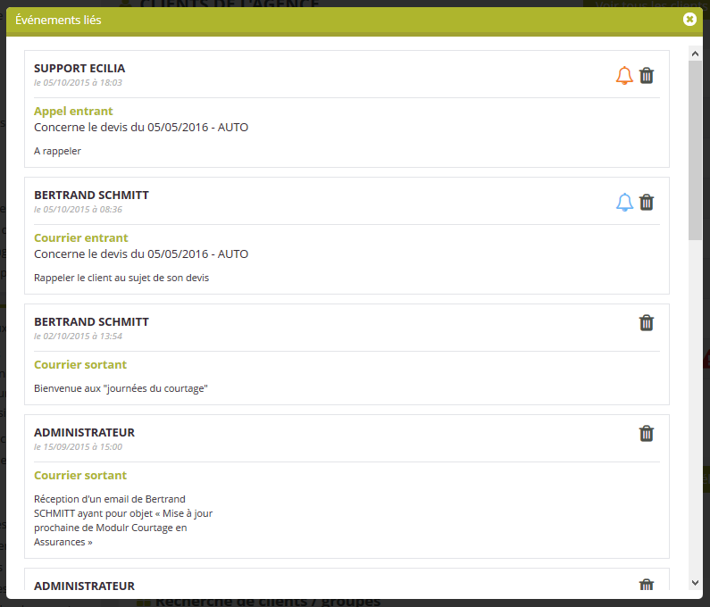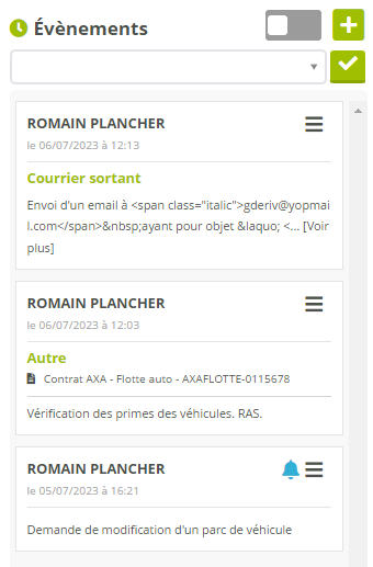Un clic sur l'icône de l'historique des événements vous permet d'ouvrir une fenêtre pop-up récapitulative des éléments de l’historique. L'affichage des éléments se fait de la même manière que pour l'affichage depuis les fiches, y compris pour l'icône vous informant de la présence d'un rappel associé à un événement.
