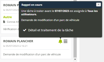 Toutes les tâches en cours associées à la fiche sont également affichées dans l’historique des événements. Elles apparaissent alors comme des événements assortis d’un rappel sous la forme d’une icone de cloche.