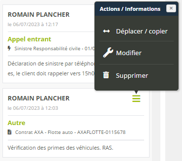 Exemple : quelqu’un a notifié un appel client sur une fiche A, alors qu’elle concernait une fiche client B. Vous pouvez déplacer la Note vers la fiche B au lieu de supprimer et de la ressaisir.