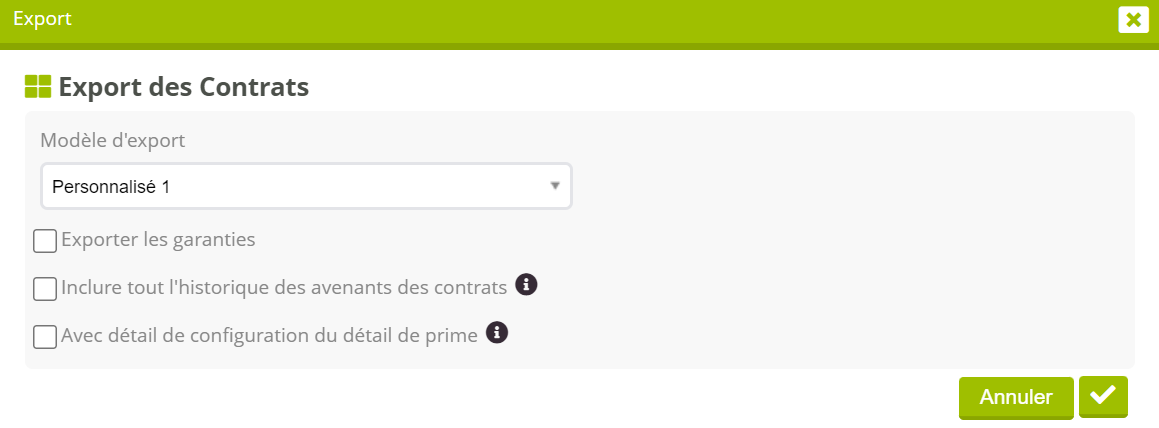 Fenêtre d’export des contrats avec ses options spécifiques.