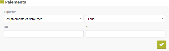 L’export des paiements vous permet de produire un tableau de l’ensemble des paiements et/ou ristournes affectés et/ou non-affectés entre deux dates.