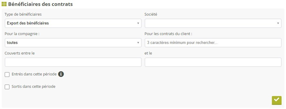 L'export des bénéficiaires vous permet de produit un tableau de l’ensemble des bénéficiaires associés aux contrats concernés, ce qui peut concerner des bénéficiaires (personnes), des véhicules ou des immeubles. Par défaut l’export prend en compte les contrats de tous les clients du portefeuille, mais vous pouvez isoler un client en particulier.