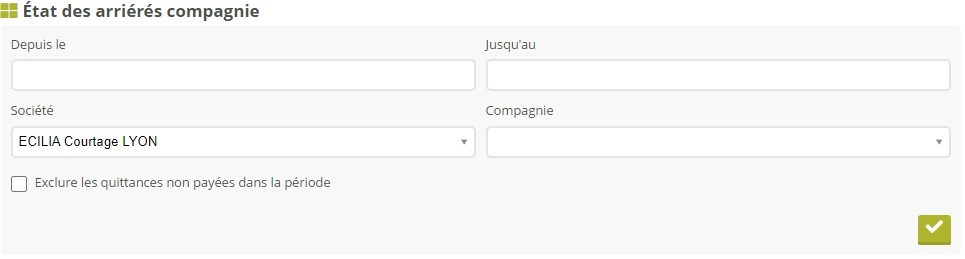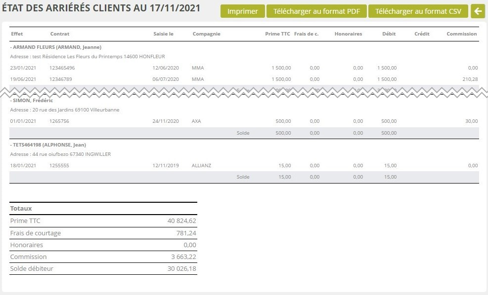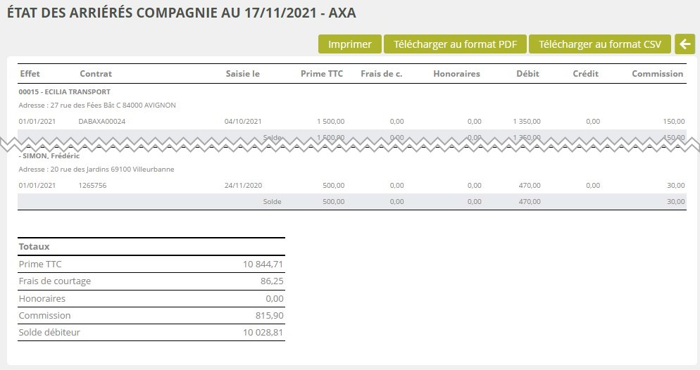 Cet encart vous permet de produire un tableau de synthèse des commissions impayées pour un assureur et une période données. Le tableau peut alors être imprimé, téléchargé au format PDF, ou au format CSV.