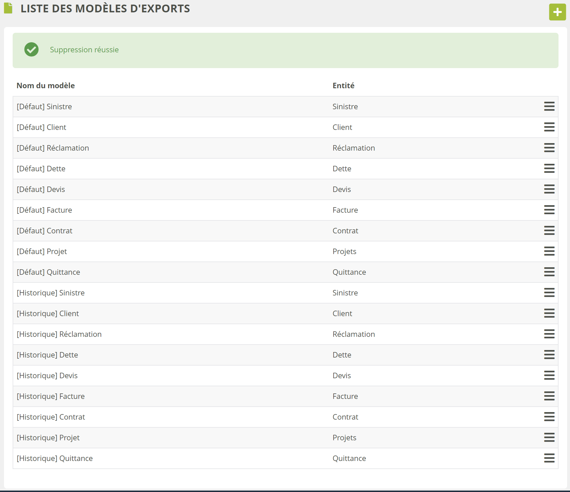 Chacun de ces exports propose un modèle par défaut indiqué “[Défaut]". Ce modèle est non modifiable et non supprimable. Il sera toujours disponible aux utilisateurs. En revanche il peut être dupliqué pour servir de base à un nouveau modèle.