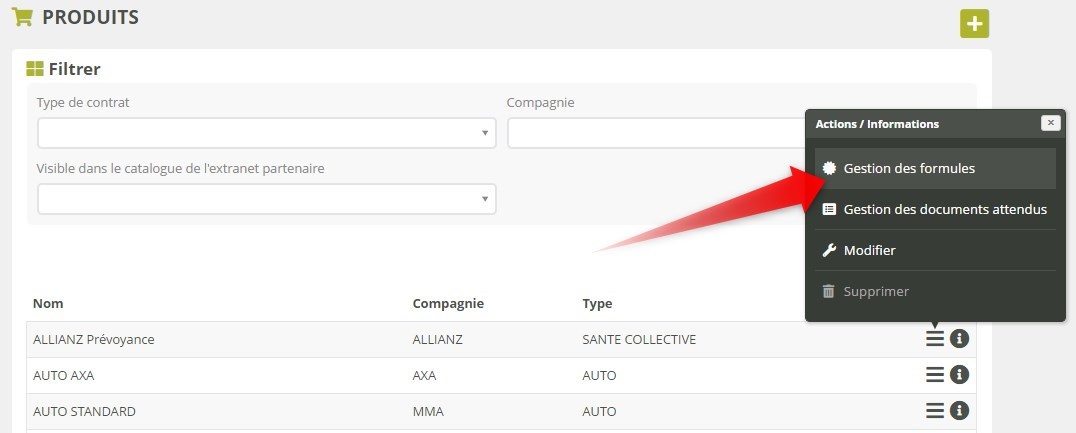 Vous pouvez définir un catalogue de formules sur un produit depuis la page des produits : dans le menu d’actions du produit concerné, cliquez sur Gestion des formules :