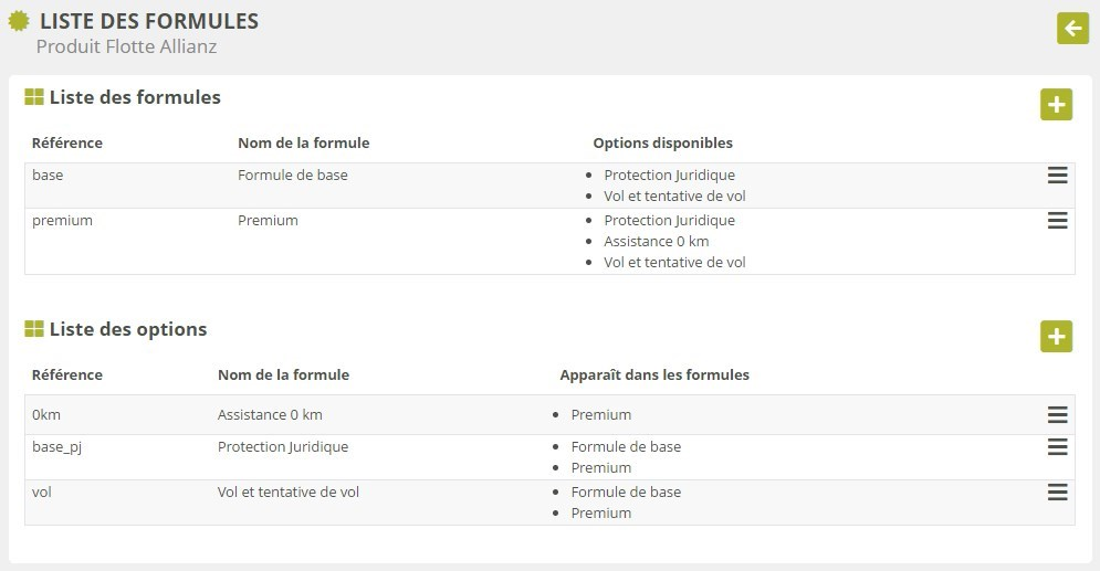 Cette page liste l’ensemble des formules de base, et l’ensemble des options pouvant y être attachées. Chacune est affichée avec les informations suivantes :