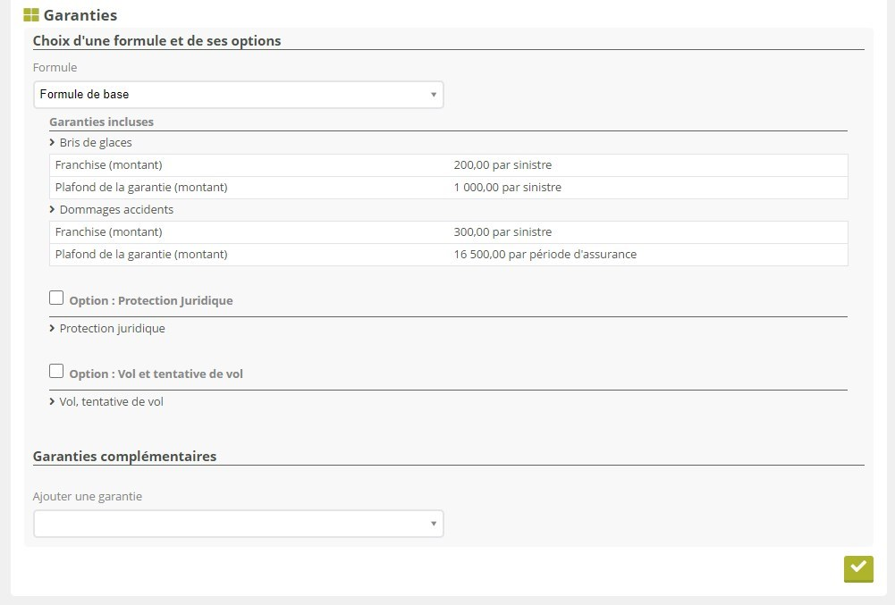 Vous pouvez en plus préciser une formule de garanties applicable sur l’ensemble du contrat, au niveau de chaque avenant, ou au niveau de chaque bénéficiaire / immeuble / véhicule. Chaque formule peut proposer des garanties optionnelles que vous pouvez activer en complément. Les garanties incluses, les options, et les garanties complémentaires se cumulent entre elles.