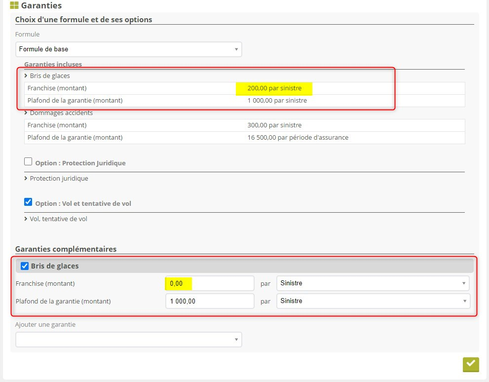 Sur un contrat Auto, votre formule inclut une garantie Bris de glace avec 200€ de franchise. Vous souhaitez faire sauter la franchise pour un client donné. Pour cela ajoutez à nouveau le Bris de glaces en tant que garantie complémentaire, et modifiez la franchise à 0 :