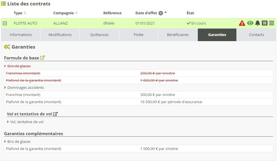 Vous pouvez gérer des garanties individuellement sur l’ensemble du contrat, au niveau de chaque avenant, et même plus spécifiquement au niveau de chaque bénéficiaire / immeuble / véhicule. Ces fonctionnalités sont détaillées dans l’article Garanties.