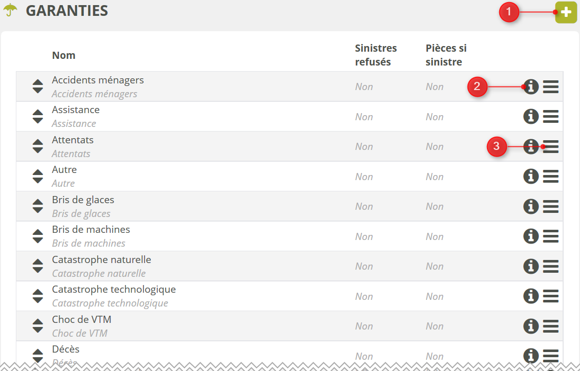 La liste des garanties configurées dans la plateforme affiche en lecture directe le nom de la garantie, son nom public (si renseigné) et indique si la déclaration de sinistres depuis l'extranet est autorisée ou non.