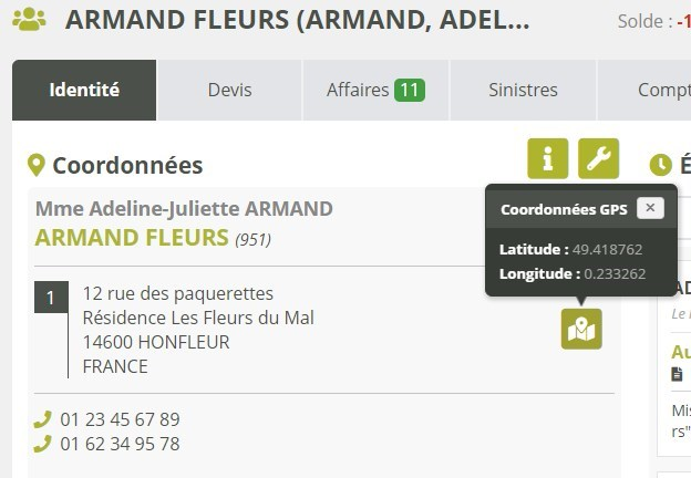 En cliquant sur ce même bouton, vous accédez à une Google Map intégrée qui vous permet de visualiser les adresses géolocalisées du client, grâce à ces nouvelles coordonnées.