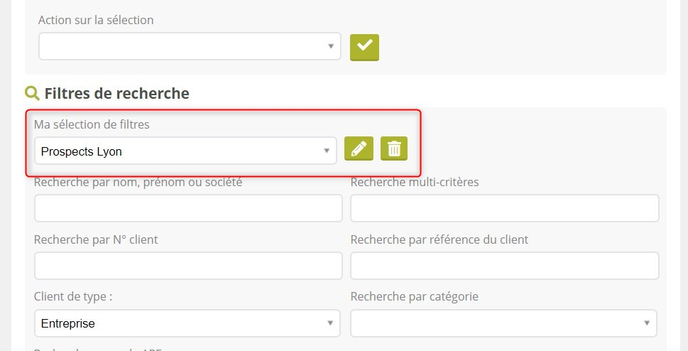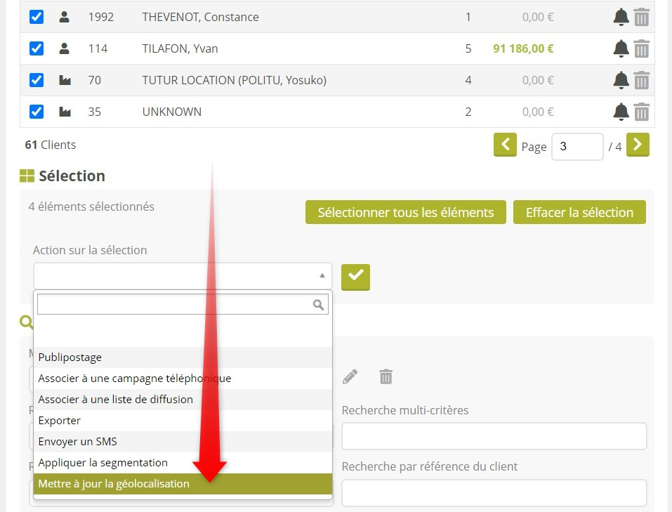 Vous pouvez mettre votre répertoire clients à jour rapidement en demandant une géolocalisation de masse. Sur la liste des Clients, définissez une sélection de fiches et utilisez l’action sur sélection « Géolocaliser » :