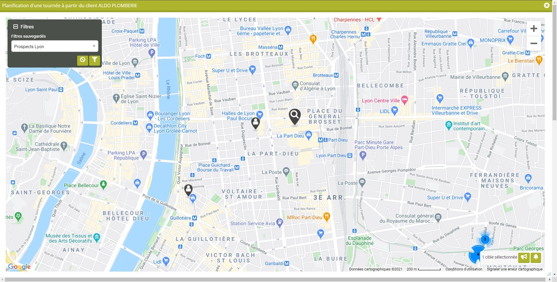 Depuis la Google Map d’un client de référence, cliquez sur le bouton « Planifier une tournée dans ce secteur » en bas de la Google Map, et visualisez vos clients et prospects situés dans cette région.