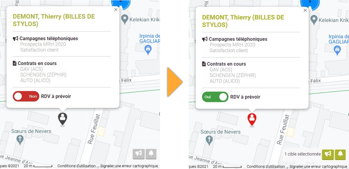 L’interrupteur « RDV à prévoir » situé en bas de l’infobulle permet d’un clic de sélectionner/désélectionner la cible pour votre tournée. Dès qu'une cible est sélectionnée de cette façon, son marqueur devient rouge. En outre, le cartouche situé dans le coin inférieur droit de la carte vous rappelle le nombre de cibles sélectionnées jusque-là.