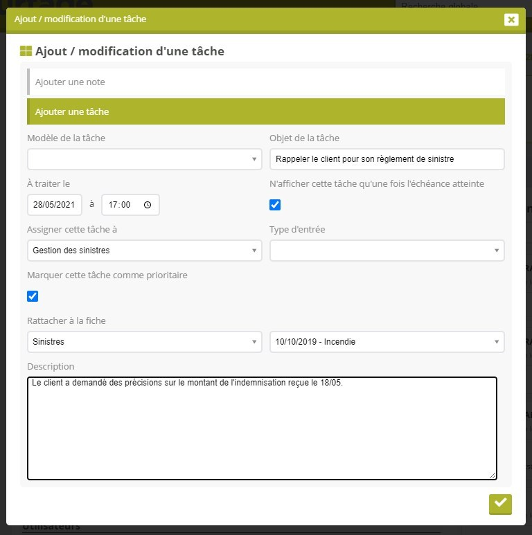 Le type d'entrée : typer vos tâches vous permettra par la suite de filtrer les listes de tâches plus facilement. Exemple : si vous voulez cibler en priorité les rappels de clients, ou traiter uniquement les tâches IARD, il est conseillé d'avoir indiqué au préalable sur ces tâches un type d'entrée “Appels sortants” ou “IARD”. Les valeurs de cette liste sont entièrement paramétrables (Voir « Listes personnalisées »).