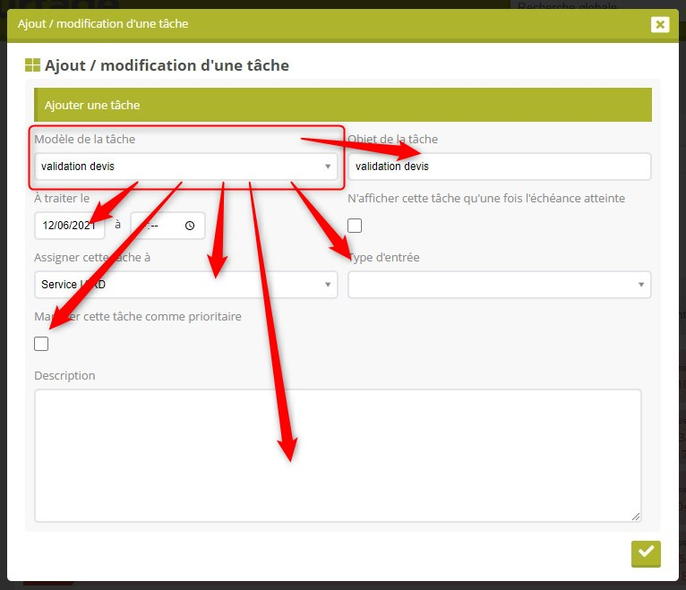 Au fur et à mesure, certaines tâches vont peut-être devenir répétitives. Afin d'éviter de ressaisir à chaque fois les informations de votre tâche, il est conseillé d'utiliser un modèle de tâche. Une fois le modèle choisi dans la liste proposée, les champs de la tâche se préremplissent ; il vous suffit de compléter et d'ajuster les informations, avant de valider la création de la tâche.