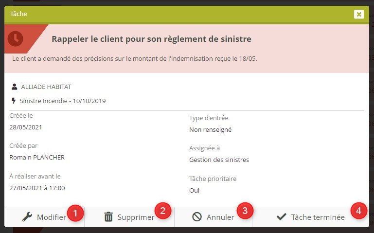 Lorsqu'une tâche est en cours ou en retard, 4 options sont proposées :
