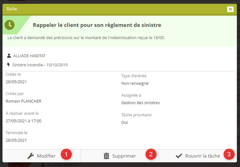 Lorsqu'une tâche a été terminée ou annulée, 3 options sont possibles :