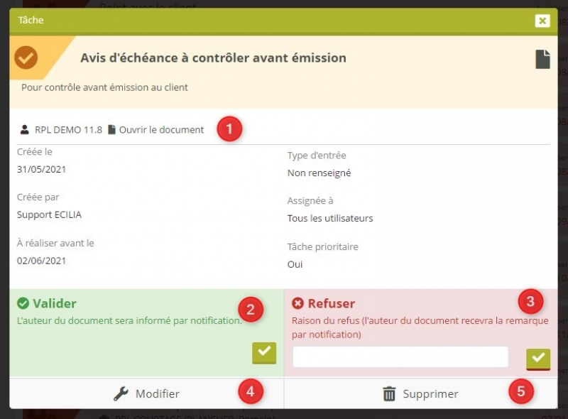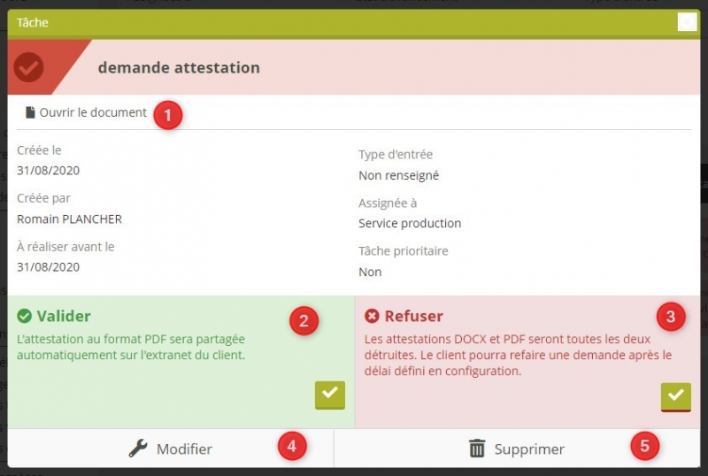 Tâche de validation d'attestations Ces tâches sont créées pour une demande d'attestation effectuée depuis l'extranet client. Le document demandé est généré dans la GED du client, mais ne lui est pas partagé tant que vous ne le validez pas via la tâche associée.