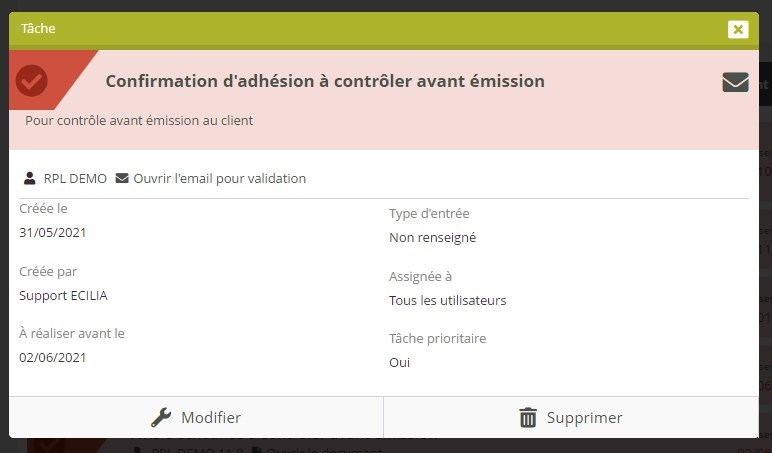 Si une tâche a été générée automatiquement par un modèle (voir l'article « Tâches prédéfinies »), elle peut avoir une forme qui diffère des deux cas précédents : il peut s'agir d'une tâche de validation vous demandant de contrôler un email ou un document généré avant qu'il ne puisse être exploité.
