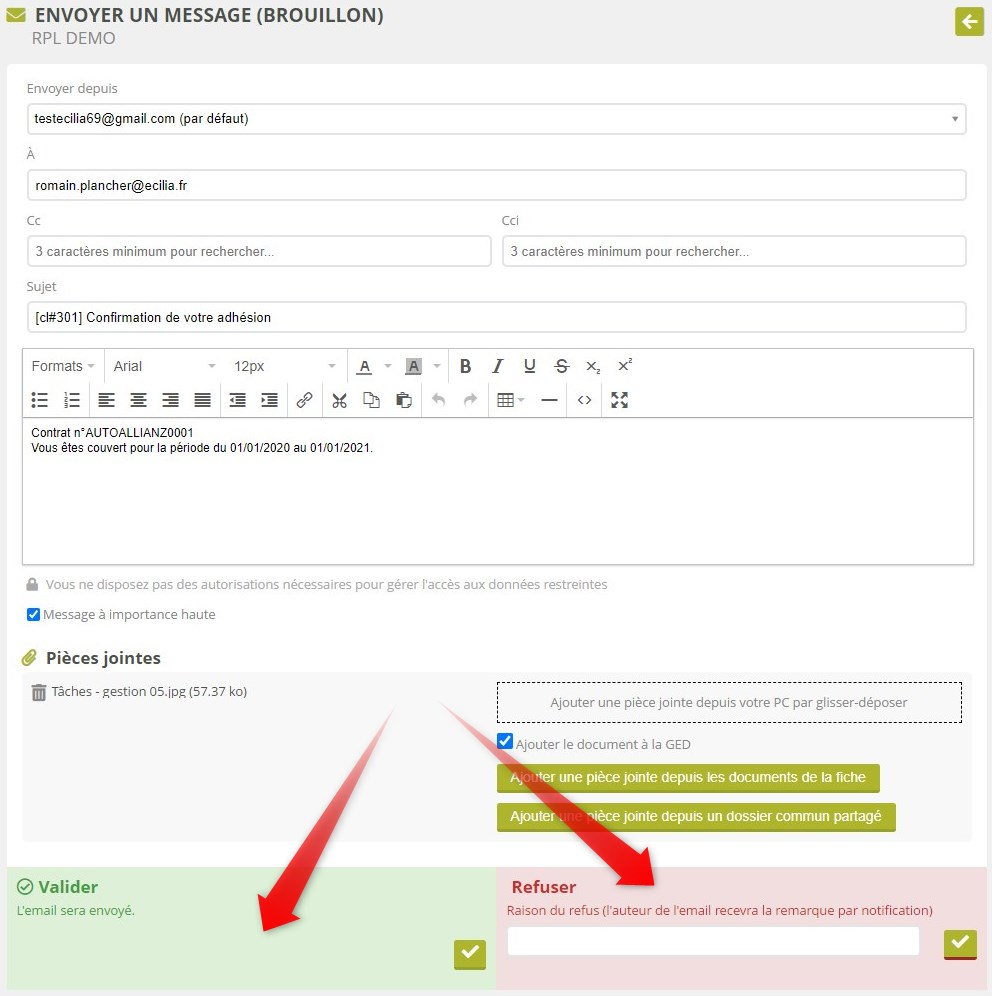 La validation ou le refus provoque la clôture de la tâche associée à l'email.