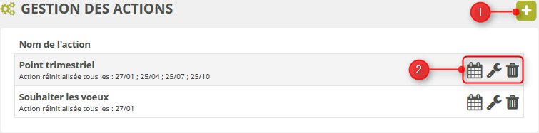 La gestion des actions se présente comme une liste de toutes les actions configurées dans la plateforme. Cette interface est utilisée afin de paramétrer des actions à réaliser sur tous les clients avec un renouvellement automatique à dates programmées. Vous pouvez visualiser directement depuis la liste le nom de chacune des actions existantes ainsi que leurs dates de renouvellement.