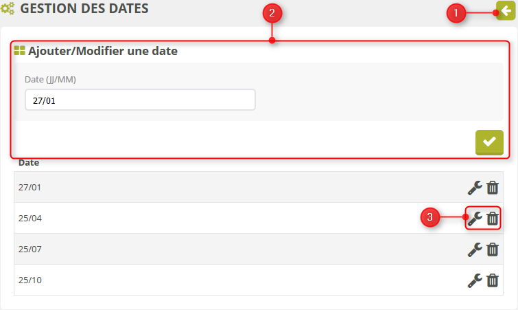Ajouter une nouvelle date ou modifier une date existante. Si vous n'avez pas cliqué sur l'icône de modification d'une date, le système considérera que la date renseignée doit être ajoutée.