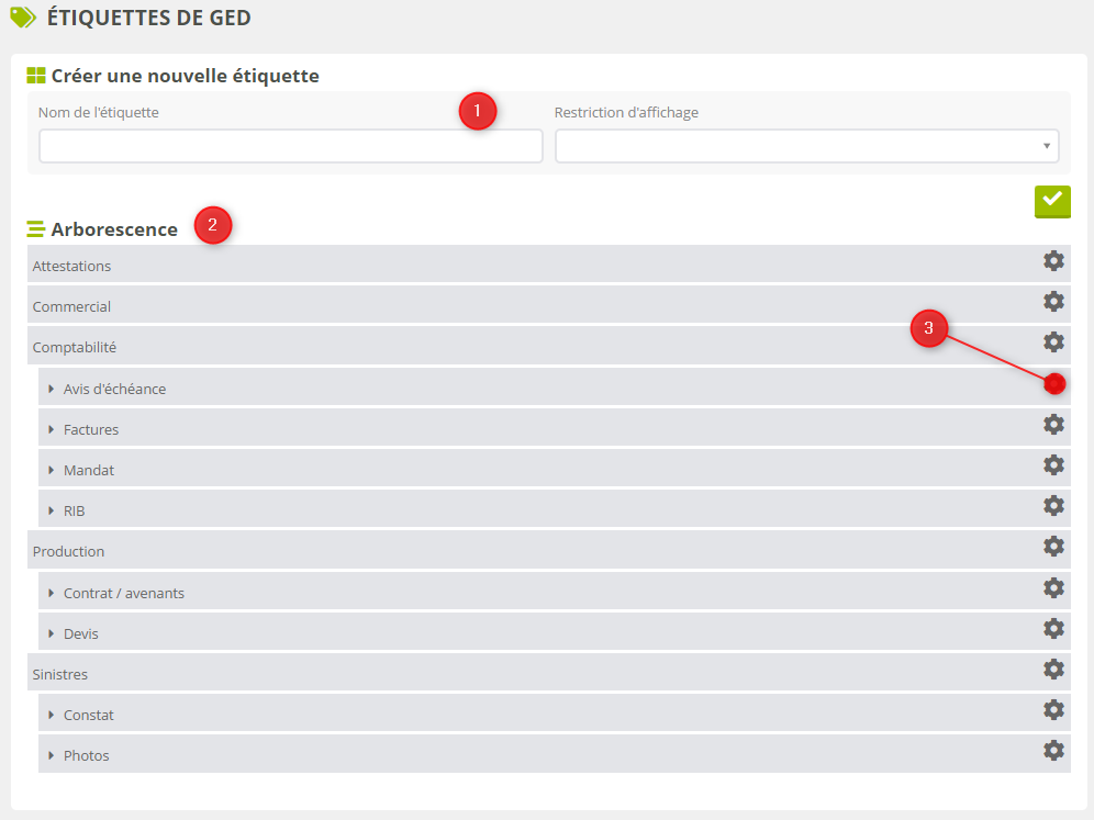 La gestion des étiquettes de classement se présente comme une liste hiérarchisée de toutes les étiquettes thématiques configurées dans la plateforme. Les étiquettes sont utilisées dans la gestion électronique de documents (GED, voir l'article « Gestion documentaire ») afin de classer les différents documents et emails d'une fiche (client, contact, etc.) dans une arborescence.