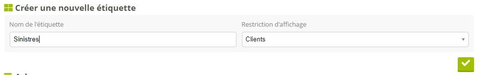 Pour ajouter une étiquette, il suffit de lui donner un nom et de valider. Si cette étiquette et celles qui en dépendent ne concernent qu’une entité, vous pouvez le préciser dans restriction d'affichage. Par exemple, des étiquettes ne concernant que le dossier client n’ont pas besoin d’apparaître sur les fichiers compagnie, apporteur, contact.