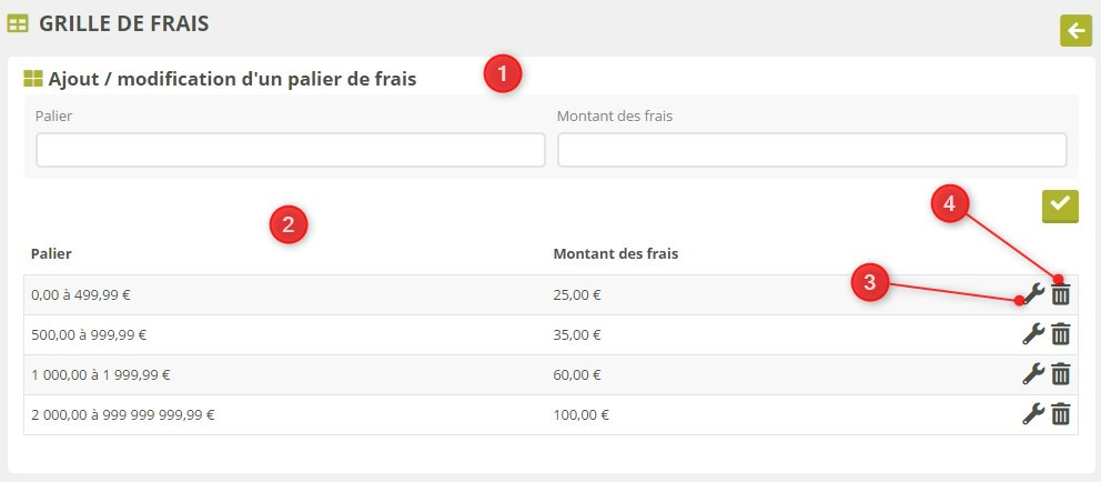 Modifier un palier : cela charge les valeurs du palier dans les champs Palier et Montant de frais ; il vous suffit alors de les modifier puis de valider.