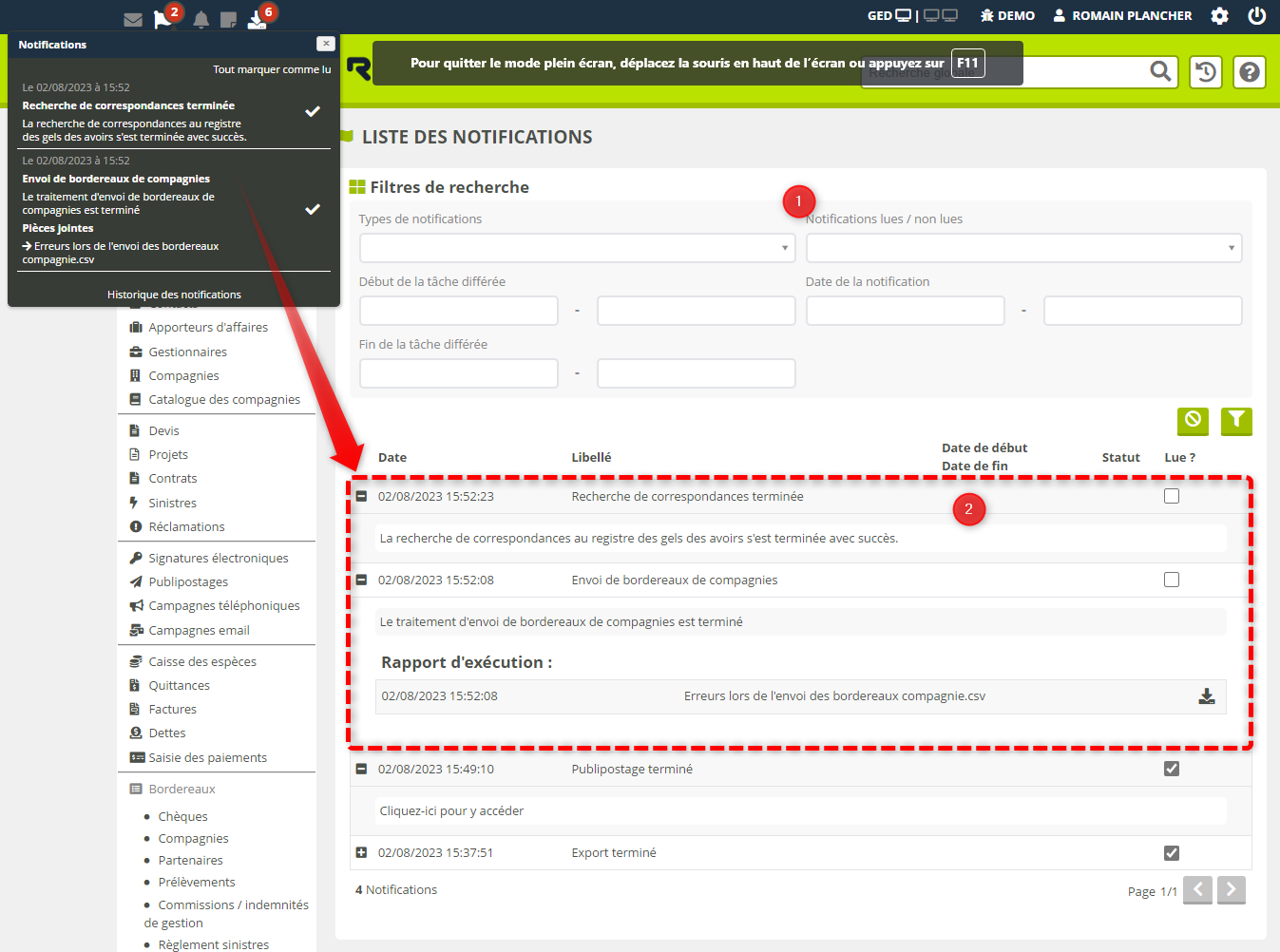 date de la notification : pour isoler toutes les notifications survenues entre deux dates. la plupart du temps. Exemple : un export de contrats réalisé selon des critères précis le 15 mars que vous souhaitez récupérer au lieu de le régénérer depuis la page Contrats).