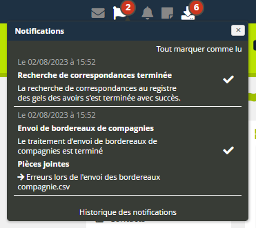 Cette fenêtre n’est qu’un aperçu rapide dont la durée de vie est limitée : si vous indiquez une notification comme lue en cliquant sur la coche, elle disparaît de la liste. Le lien “Historique des notifications” situé tout en bas de la liste vous permet de retrouver l’ensemble des notifications enregistrées.