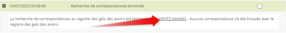 Des liens internes peuvent également être proposés, comme par exemple un lien vers la fiche client pour laquelle vous avez demandé une recherche au registre du gel des avoirs :