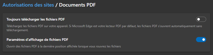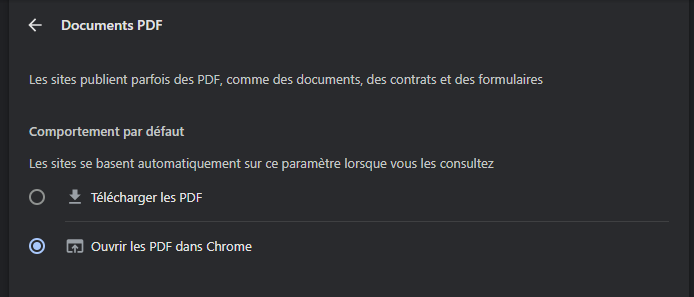 Dans les paramètres du navigateur, se rendre dans Cookies et autorisations de sites, puis Documents PDF. S’assurer que la case Toujours télécharger les fichiers PDF est décochée.