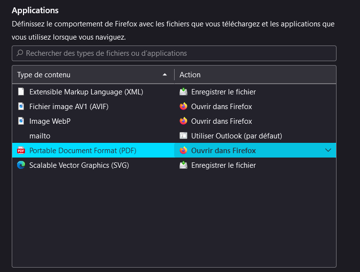 Dans les paramètres du navigateur, dans la section Application, le comportement pour les documents PDF doit-être défini tel que ci-dessous.