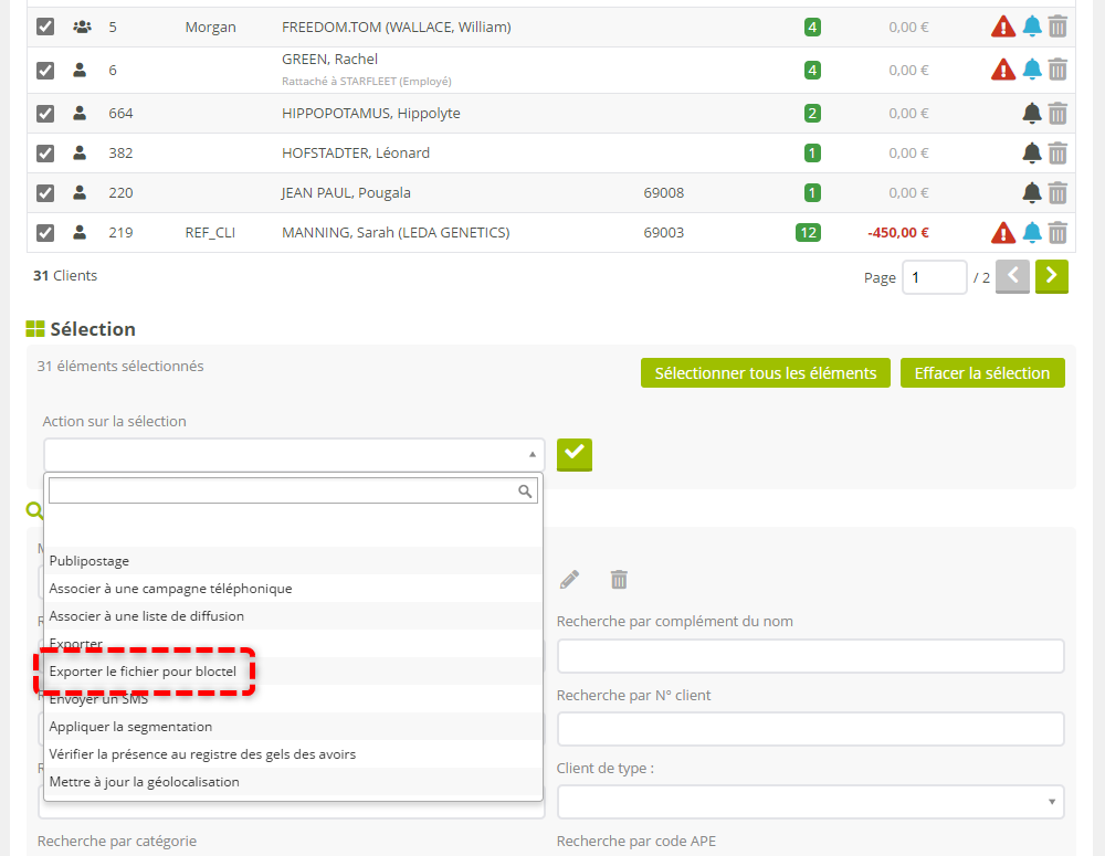Effectuez une sélection de Clients puis appelez l’action sur sélection “Exporter le fichier pour Bloctel".