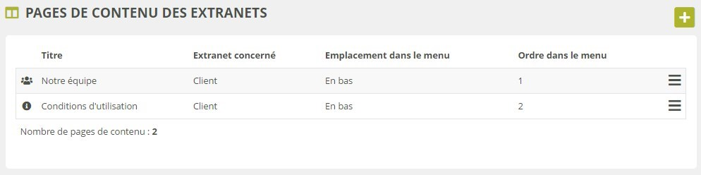 Depuis la page Administration, cliquez sur « Pages de contenus des extranets ». La page suivante s’ouvre et vous présente la liste des pages actuellement configurées :